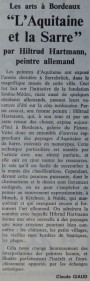 ".......La technique paticulière (monotypes) est maniée par l' artiste avec une sureté parfaite, elle sait en tirer toutes les ressources. Je sais qu' il est facile de succomber à la manie des classifications. Cependant devant sette peinture puissante, dont le chromatisme et le dessin sont fortement soulignés, on ne peut s' empêcher de penser au mouvement expressioniste, à Munch, à Kirchner, à Nolde, qui marquèrent et marquent encore si fortement l' art allemand. On admirera la manière avec laquelle Hiltrud Hartmann donne une sève nouvelle à des paysages que nous croyions pourtant bien connaître...." Claude Giaud "Sudouest Bordeaux"